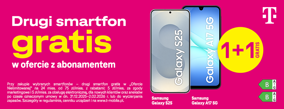 Przy zakupie wybranych smartfonów – drugi smartfon gratis w „Ofercie Nielimitowanej” na 24 mies. od 75 zł/mies. z rabatami: 5 zł/mies. za zgody marketingowe i 5 zł/mies. za obsługę elektroniczną, dla nowych klientów oraz aneksów po czasie oznaczonym umowy w dn. 31.12.2025-2.02.2026r. lub do wyczerpania zapasów. Szczegóły w regulaminie, cenniku urządzeń i na www.t-mobile.pl.