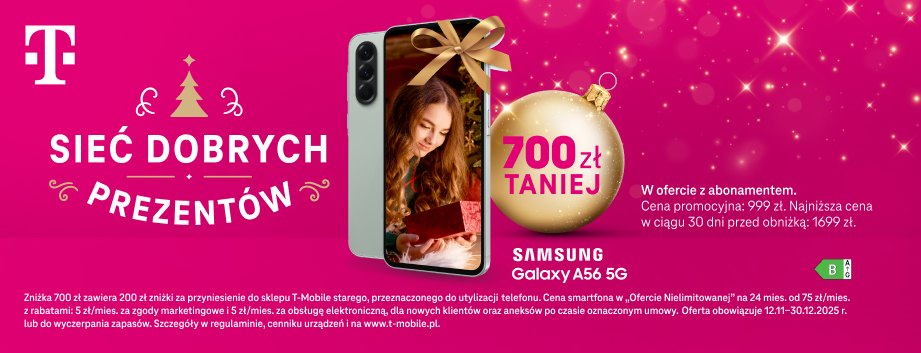 Sieć dobrych prezentów. Teraz Samsung Galaxy A56 5G 700 zł taniej w ofercie z abonamentem. Zniżka 700 zł zawiera 200 zł zniżki za przyniesienie do sklepu T-Mobile starego, przeznaczonego do utylizacji telefonu. Cena smartfona w „Ofercie Nielimitowanej” na 24 mies. od 75 zł/mies. z rabatami: 5 zł/mies. za zgody marketingowe i 5 zł/mies. za obsługę elektroniczną, dla nowych klientów oraz aneksów po czasie oznaczonym. Oferta obowiązuje do 30.12.2025 lub do wyczerpania zapasów.