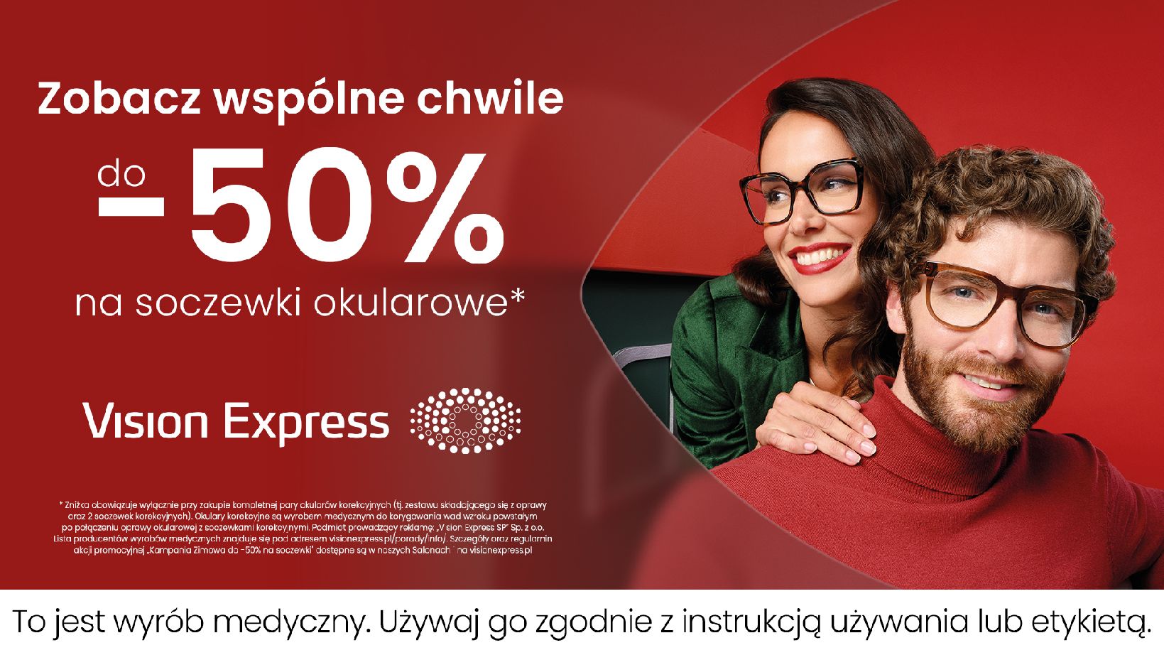 Okulary korekcyjne są wyrobem medycznym do korygowania wad wzroku powstałym po połączeniu oprawy okularowej z soczewkami korekcyjnymi. Podmiot prowadzący reklamę: „Vision Express SP” Sp. z o.o. z siedzibą w Warszawie. Lista producentów wyrobów medycznych dostępna pod adresem visionexpress.pl/porady/info/.